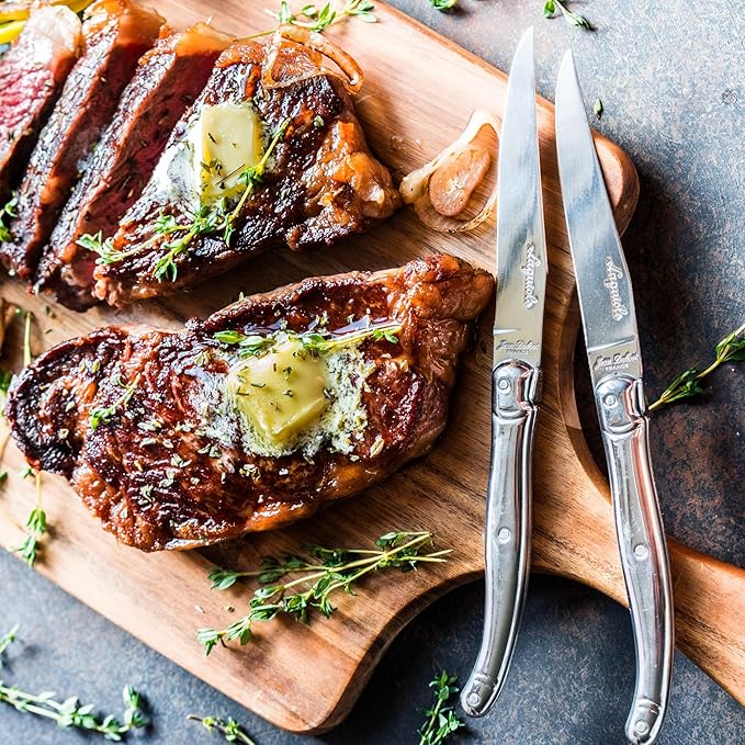 - STAINLESS STEEL BLADES - Master cutlers forge, polish, and sharpen the 1.2 mm, stainless steel blades by hand, just like in traditional French knife making. Then, they rivet their handles onto the grip, giving each knife its own character.