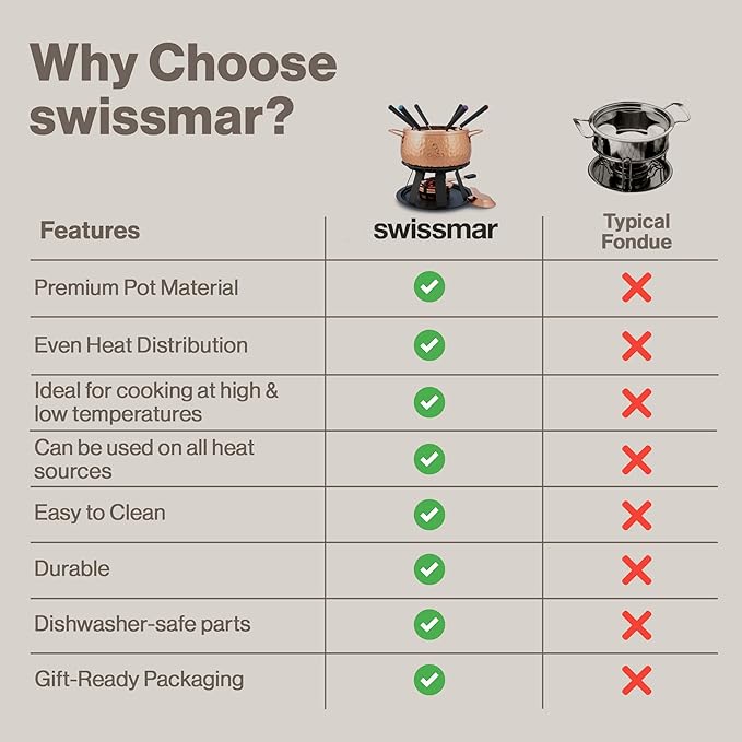 - Versatile Design: This multi-purpose fondue set features a durable copper-plated pot with a sleek interior ideal for broth or oil-based fondues. Its heat-retaining design and elegant presentation make it perfect for both casual and festive gatherings. Also great for one-pot meals such as chili, hearty soups, Swedish meatballs, hot nacho, and veggie dips.