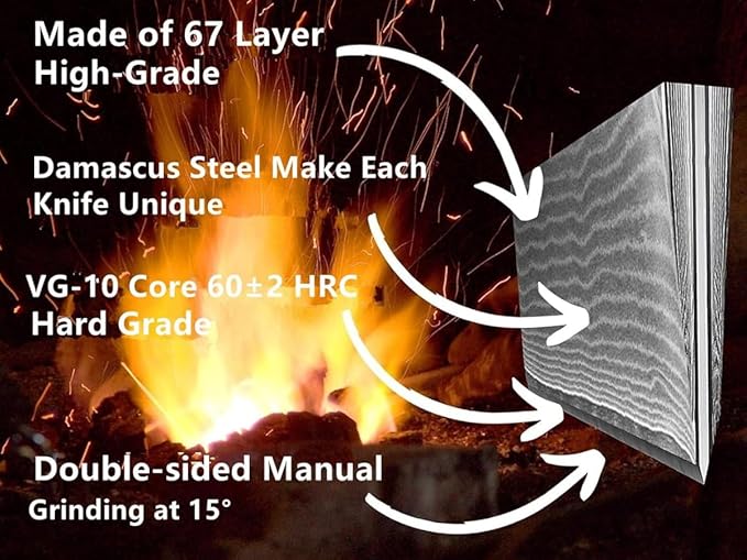 - Premium materials and exceptional construction – Every knife in this Damascus kitchen knife set features 67 layers of high-quality Damascus steel surrounding a VG10 core. This multi-layer composition ensures impressive durability, long-lasting sharpness, and enhanced resistance to corrosion for daily culinary use.