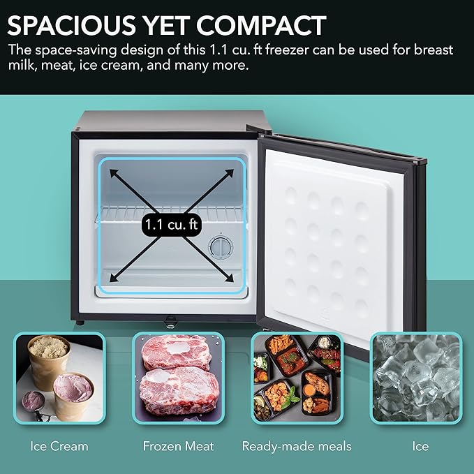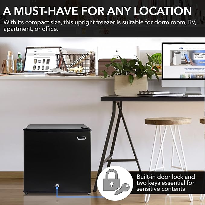 - Secure Storage: The perfect freezer for garages, offices, basements and other small spaces, this compact freezer includes a cylinder lock and 2 keys for added security when storing your food
