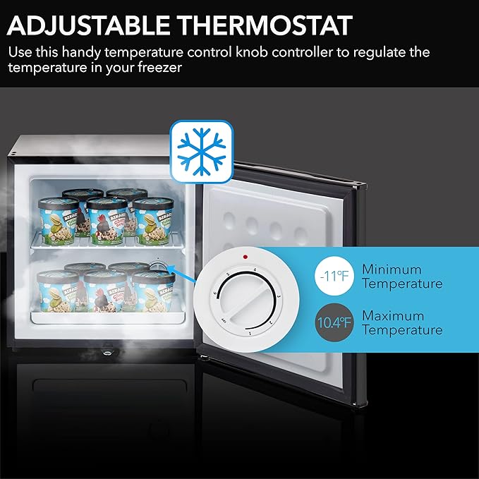 - Consistent Temperature: Built to ensure efficient temperature distribution, this compact freezer features a mechanical temperature control setting ranging from -11°F – 10.4°F