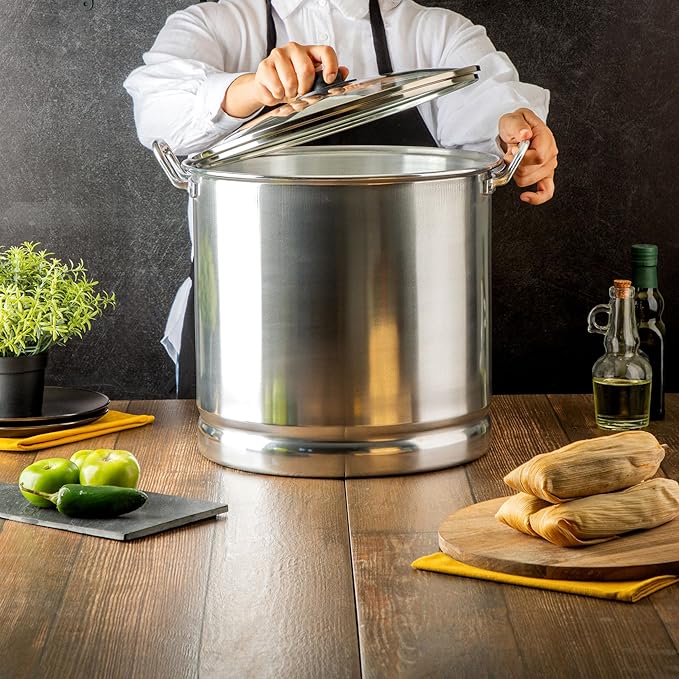 - MULTI-PURPOSE STEAMER/ STOCKPOT: This 32-quart pot is a kitchen must-have, can handle several tamales and accommodate a variety of dishes like Atole, Pozole, Barbacoa, Menudo, Seafood, Vegetables, Rice, and Broth. Its wide base and high wall design preserves food nutrients for healthier cooking!