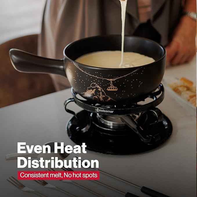 Swissmar Gruyere Cheese Fondue Set - 2.8 QT / 2.65 L - Ceramic Fondue Pot with Rechaud, Fondue Burner, 6 Forks - Ideal for Melting Cheese, Chocolate & Caramel - Black