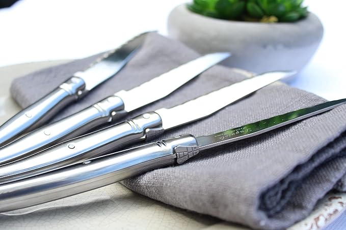 - Smooth Cutting, Even on Tough Meat: Effortlessly slice into a ribeye or filet with French Home’s Connoisseur Laguiole cutlery set for 4; the a 1.8mm thick stainless-steel serrated blades ensure precise and smooth carving of any cut of meat