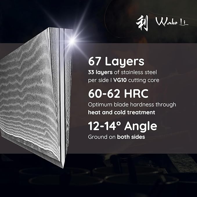 - Premium materials and exceptional construction – Each blade in this Damascus kitchen knife set is crafted from 67 layers of genuine Damascus steel surrounding a VG10 core. This multilayer composition offers outstanding strength, long-lasting sharpness, and reliable corrosion resistance for everyday culinary performance.