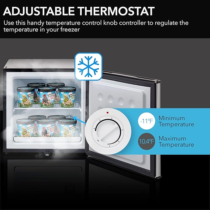 - Consistent Temperature: Built to ensure efficient temperature distribution, this compact freezer features a mechanical temperature control setting ranging from -11°F – 10.4°F