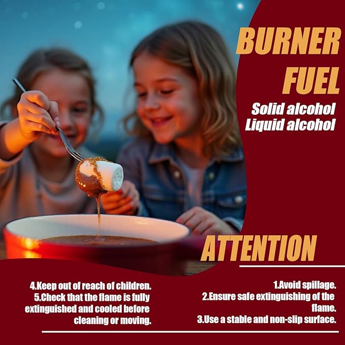 - ALL-INCLUSIVE 10-PIECE SET - We packs everything you need to start a fondue party. This includes a fondue pot, 6 pcs forks, a fondue pot base, a fondue rechaud, an adjustable stainless steel burner. Please note that the fuel should be purchased separately