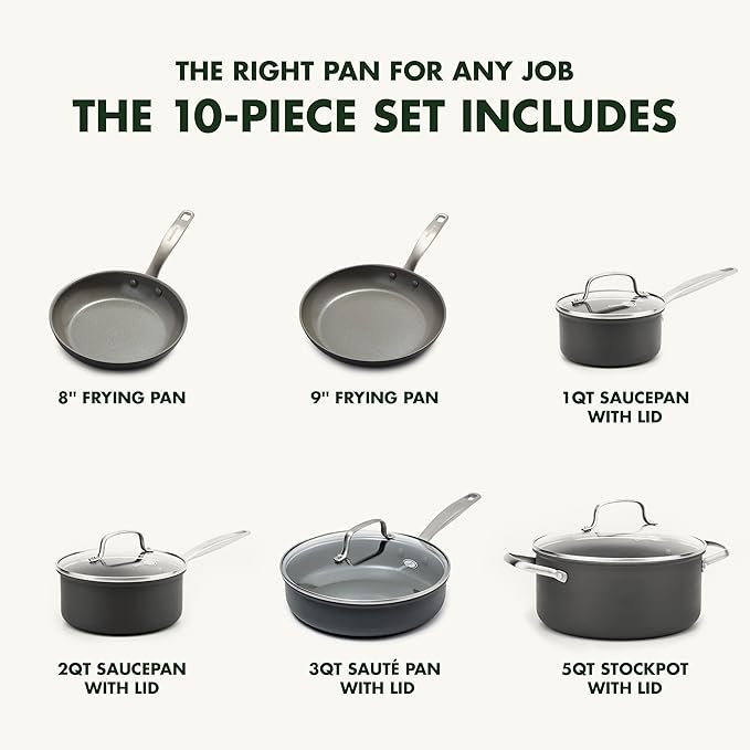GreenPan Chatham Hard Anodized Healthy Ceramic Nonstick 10 Piece Cookware Pots and Pans Set, Frying Pan Skillets, Saucepans, Saute Pan, Stockpot, Lids, PFAS-Free, Dishwasher & Oven Safe, Gray