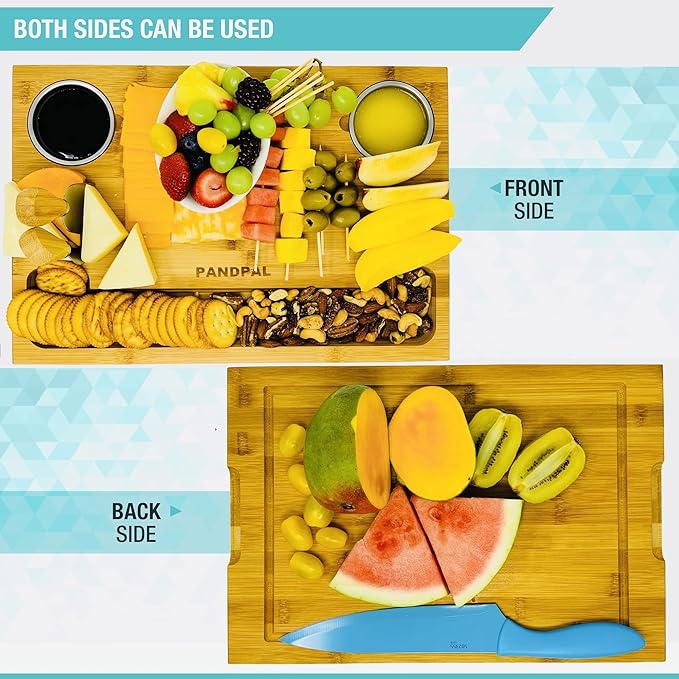 - DURABLE AND CONVENIENT: The thick bamboo wood used to make this Wood Charcuterie Platter makes it a super durable kitchen accessory that you’ll have for years. It also features side handles, reversible design and a smooth bamboo surface that is super gentle on your knives.
