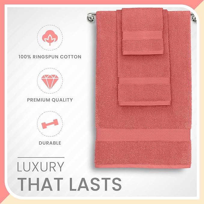 6-Piece Luxury 100% Cotton Towel Set | Quick Dry | Super Absorbent | Super Soft 100% Ringspun Cotton Towels | 2 Bath Towels | 2 Hand Towels | 2 Wash Cloths | Pink