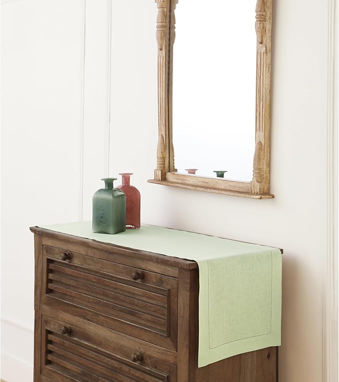 Solino Home Linen Table Runner 60 Inches - 100% Pure Linen Sage Green Hemstitch Table Runner 14 x 60 Inch Ideal for Dresser and Coffee Tables - New Year - Classic Hemstitch