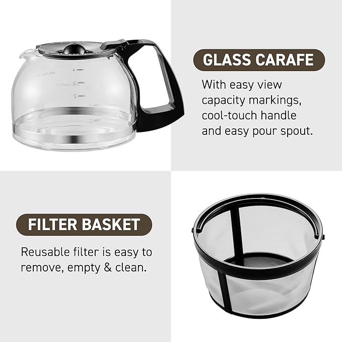 - 5 CUP GLASS CARAFE for brewing the perfect quantity of hot fresh coffee for an individual or a small group of people.