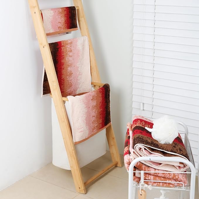 - Inspired by the tranquility of a plum garden, our towels feature a beautifully woven gradient design blending soft pink, deep red, and earth tones, adding an artistic touch and contemporary elegance to your bathroom decor