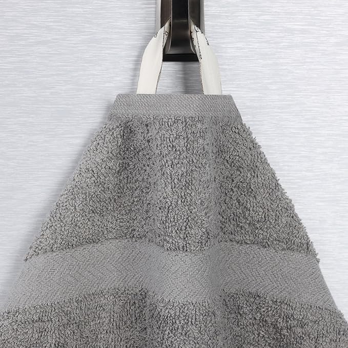 - MODERN ELEGANCE WITH CHEVRON DETAIL: Update your bathroom with these sophisticated towels boasting superb solid, eco-friendly dyed colors and a fashionable chevron trim for an elegant and contemporary touch
