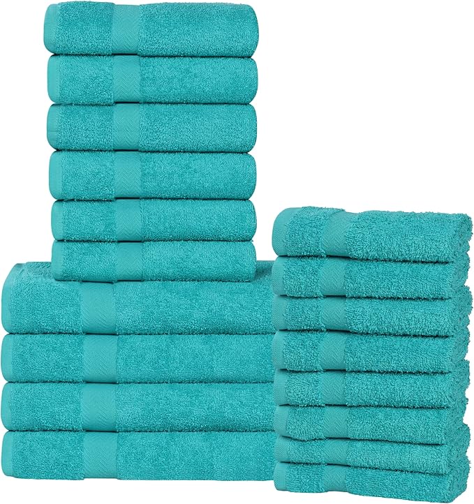 Superior 18-Piece Cotton Assorted Towel Set, Includes 8 Face/Washcloths, 6 Hand, and 4 Bath Towels, Lightweight Essentials, for Home, Beach, Bathroom, Quick Drying, Franklin Collection, Turquoise