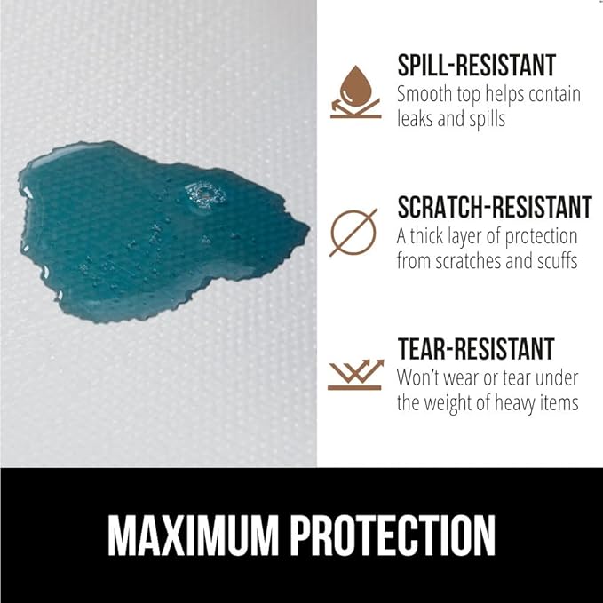 - WATER-RESISTANT, SPILL AND DRIP PROTECTION: protect your surfaces from spills leaks and stains with the Gorilla Grip DripGuard liner; premium vinyl liner is third party tested to be a water-resistant and creates a strong barrier against dirt spills and accidental leaks