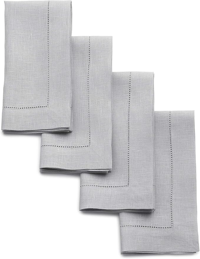 Solino Home Linen Napkins Set of 4 - Classic Hemstitch 100% Pure Linen Soft Grey Dinner Napkins Cloth 20 x 20 Inch for Winter, New Year - Handcrafted and Machine Washable