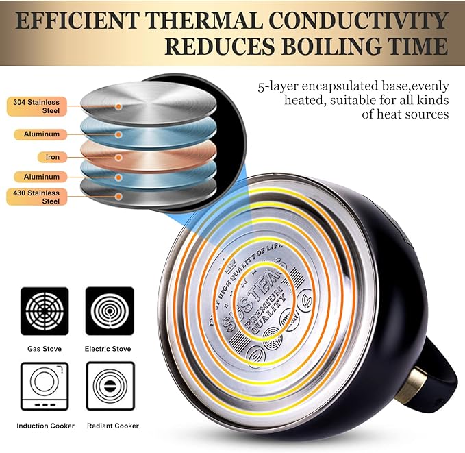 - INNOVATIVE BOTTOM BOILS WATER FASTER - SUSTEAS tea kettle is made of 5 layers encapsulated bottom, which improves heating performance while reducing heat loss, greatly shortening boiling time. It is compatible with all types of cooktops, including induction, gas, electric, halogen and radiant cooktops. You can enjoy a premium quality cup of tea or coffee at home