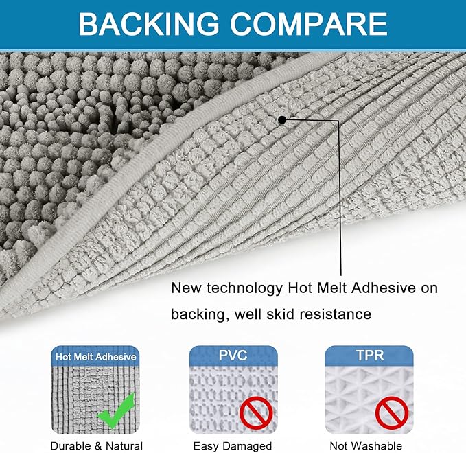 - ULTRA THICK: These bath rugs are passed GLOBAL RECYCLED STANDARD certificate. Compare the normal quality 1350g/sm, this plush chenille carpet set is more thick and bushy, quality up to 2000g/sm weight, thus make the bath mats amazing soft and cozy like a comfortable quilt protector for your feet