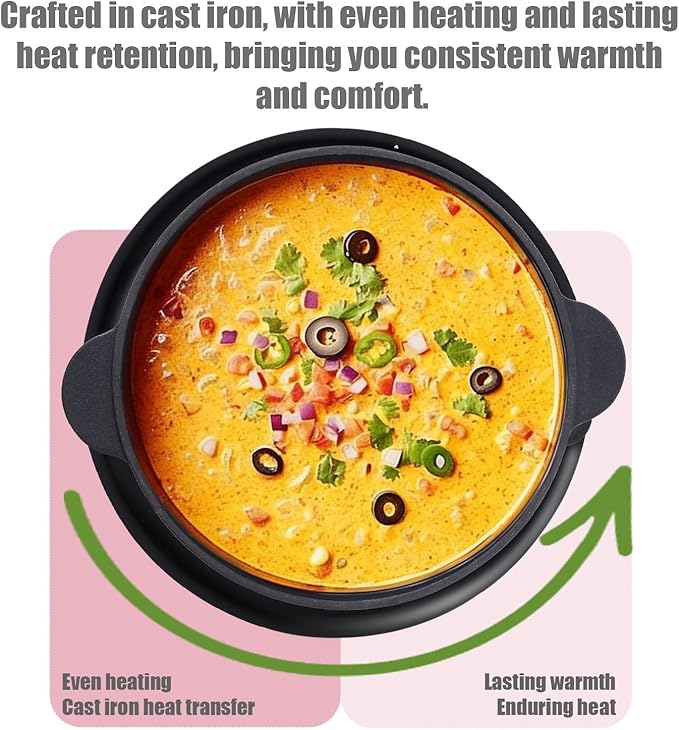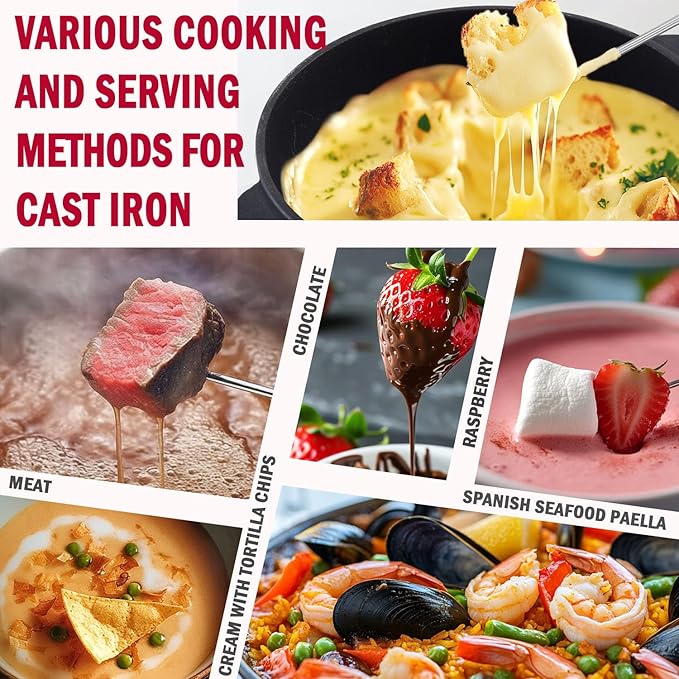 - VERSATILE CAST IRON FONDUE EXPERIENCE: Enjoy a delightful array of cheese and chocolate fondue recipes with our compact 1.26-quart cast iron fondue pot (Dimensions: 8.66" L x 7.28" W x 3.54" H). Perfect for up to 6 people, it's ideal for birthdays, daily use, family gatherings, camping trips, picnics, or any special occasion to share memorable moments with friends and family