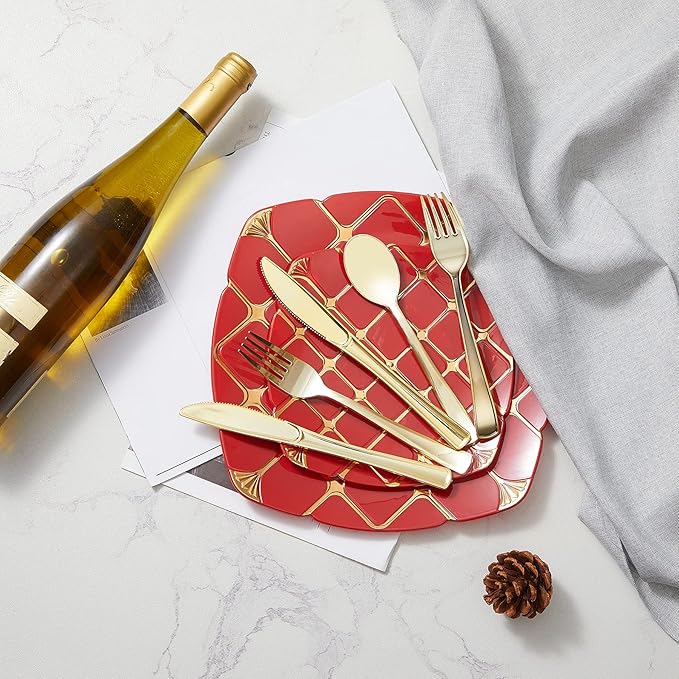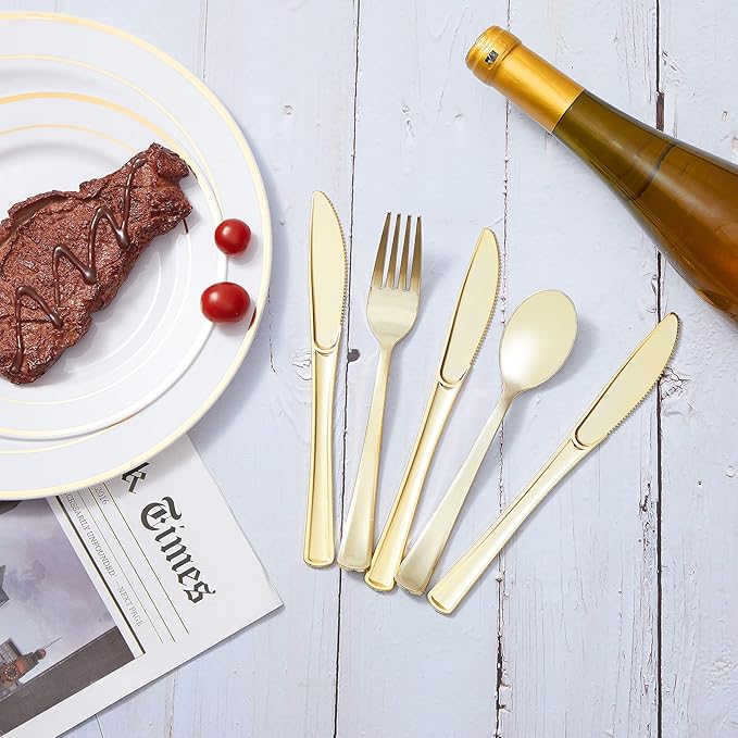- STURDIER, MORE DEPENDABLE: These gold plastic silverware are crafted using hard plastic construction. Gold plastic tableware gives an elegant look that are the perfect dinnerware solution for your birthday, party, banquet dinner, weddings, and holiday
