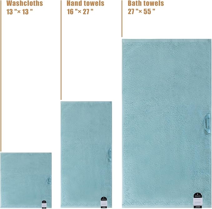 SEMAXE Bath Towel Set, 100% Cotton Bathroom Towels with Hanging Loops and Nano-Bio Lifecycle Labels, 8 Piece Towel Set Include 2 Bath Towels, 2 Hand Towels, 4 Washcloths, Blue