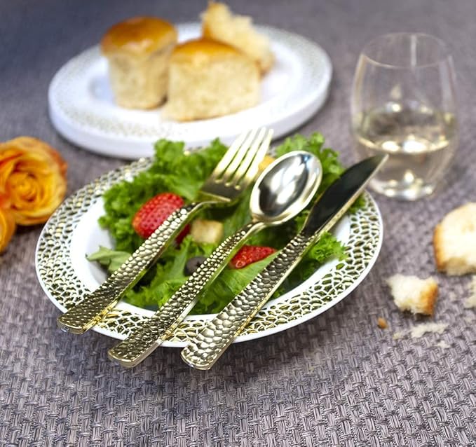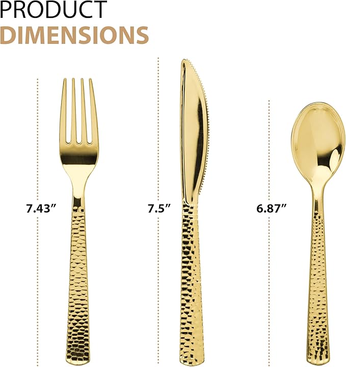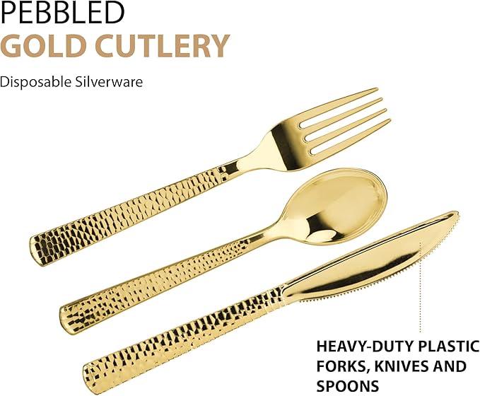 Plastic Cutlery Silverware Extra Heavyweight Disposable Flatware, Full Size Cutlery Combo, Gold Pebbled, 80 Forks, 40 Spoons, 40 Knifes, Value Pack 160 Count