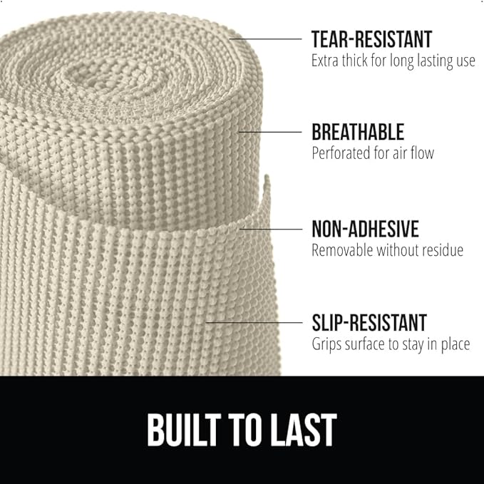 GORILLA GRIP powerGRIP Drawer Shelf and Cabinet Liner, Thick Strong Hold, Non-Adhesive Liners Protect Kitchen Cabinets and Cupboard, Bathroom Drawers, Easy Install, Breathable Mat, 12" x10' Cream