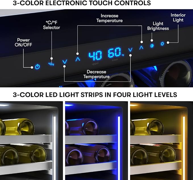 - FEATURES: Temperature range of 40 to 65 degrees Fahrenheit; Includes a door open alarm, electronic capacitive touch controls, and vibration dampening system