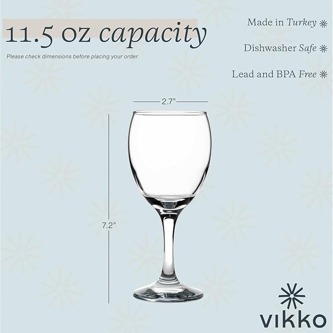 Vikko 11.5 Ounce Wine Glasses, Set of 6 Glasses for Red and White Wine With Stem, Clear Glasses for Wine, Thick and Durable Stemmed Cup