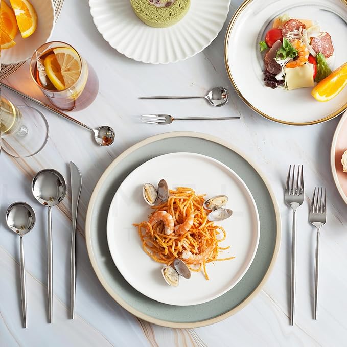 - 𝐃𝐢𝐬𝐡𝐰𝐚𝐬𝐡𝐞𝐫 𝐒𝐚𝐟𝐞 𝐒𝐢𝐥𝐯𝐞𝐫𝐰𝐚𝐫𝐞 𝐒𝐞𝐭: Designed for convenience, our forks and spoons silverware set is easy to clean & maintain. For best results, hand wash this modern luxury silverware with warm soapy water & use a soft cloth to dry thoroughly before storing. In cleaning our stainless steel utensils set, we recommend using a mild detergent (non-lemon), and avoid prolonged soaking in water, soup, or strong detergents to ensure the pristine condition of this aesthetic silverware set mirror polished.