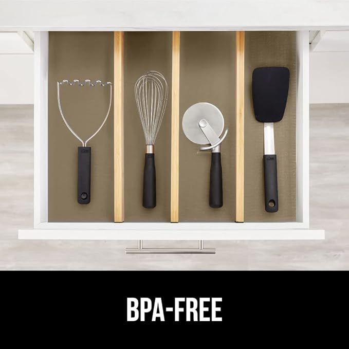 GORILLA GRIP DripGuard Shelf Liner, Non Adhesive Drawer and Kitchen Cabinet Protector, Slip Resistant BPA Free Smooth Surface Plastic Liners for Cabinets, Bathrooms, Closets, 12x120 Inch, Beige