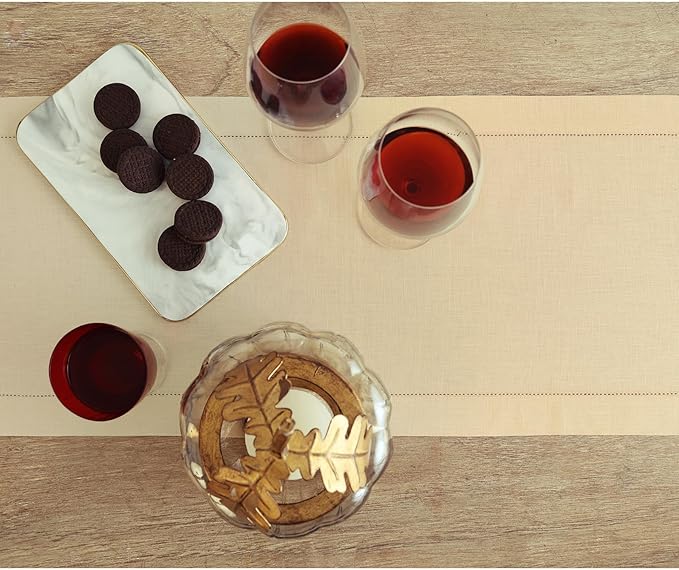 Solino Home Linen Hemstitch Table Runner 60 Inches - 100% Pure Linen Beige Table Runner 14 x 60 Inch Ideal for Dresser and Coffee Tables - New Year - Classic Hemstitch