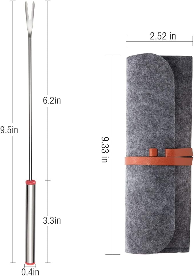 - Proper length: the total length is 9.5 inches, the handle just fits comfortably while holding in your palm, and the handle is approx. 3.3 inches, long enough to grab by hand, easy to dip in chocolate and cheese, conveniently control and adjust by the round handle