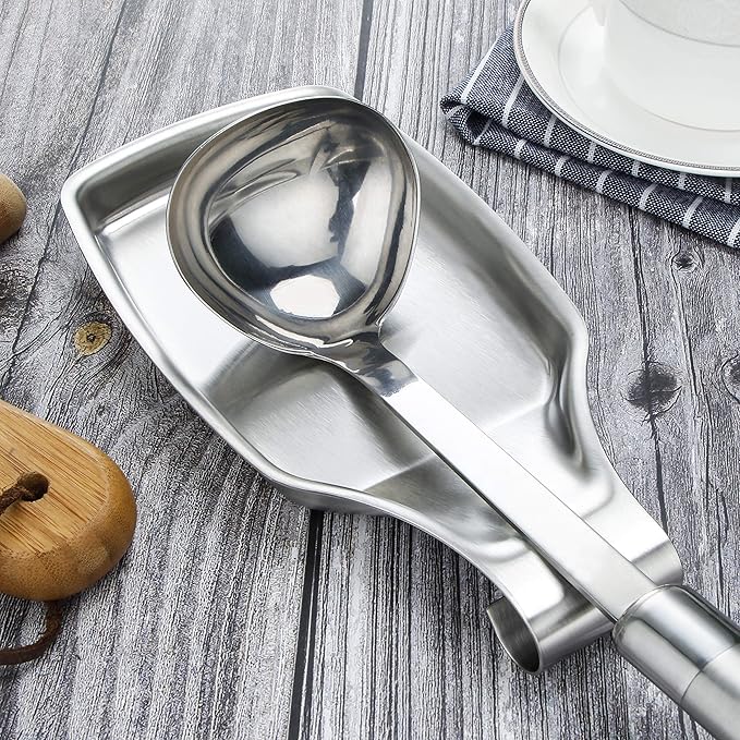 - Handy resting spot for cooking spoons or spatulas. Can be used on countertop or stovetop.With a curled edge, perfect for hanging or displaying