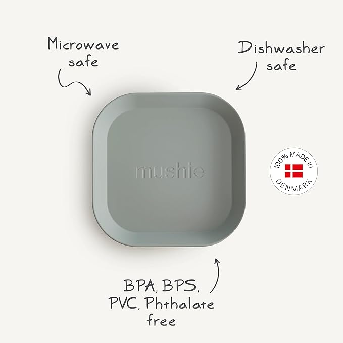 - What's included: 2 plates. With soothing colors and a clean, modern design, Mushie plastic plates are simple and perfectly sized for your little one to hold and use.