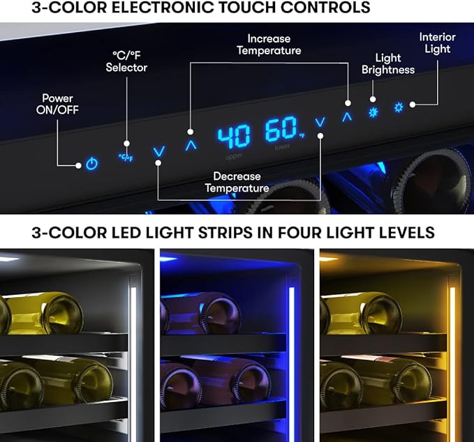 - Capacity: 45 bottles / Zero-Clearance Door Hinge / 3-Color LED Lighting in Cloud White, Deep Blue and Amber