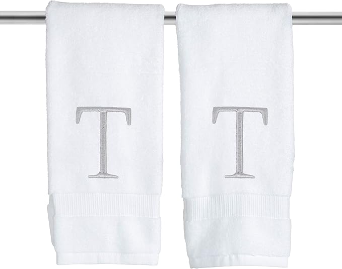 Monogrammed Hand Towels for Bathroom - Luxury Hotel Quality Personalized Initial Decorative Embroidered Bath Towel for Powder Room, Spa - GOTS Organic Certified - Set of 2 Letter T