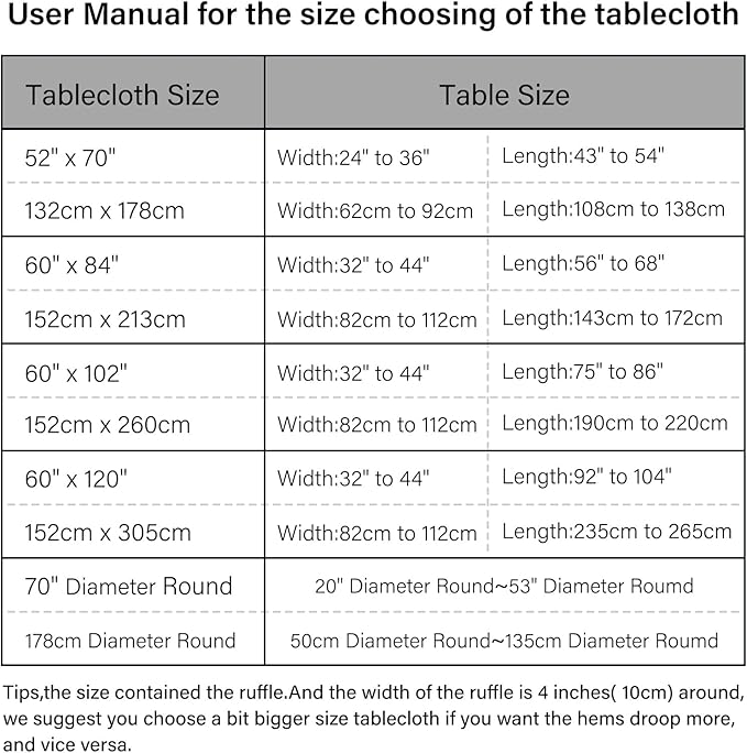 - [SIZE] : 60x102 inches(152x260cm),which fits to the TABLE WIDTH at 32"~44" (82~112cm) and TABLE LENGTH at 75"~86" (190~220cm). It looks great on oval tables as well.Tips,the size contained the ruffle.And the ruffle length is 4 inches( 10cm) around ,we suggest you choose a bit bigger size tablecloth if you want the hems droop more,and vice versa. We want to ensure you are matched with the perfect size and have a tablecloth you'll love.