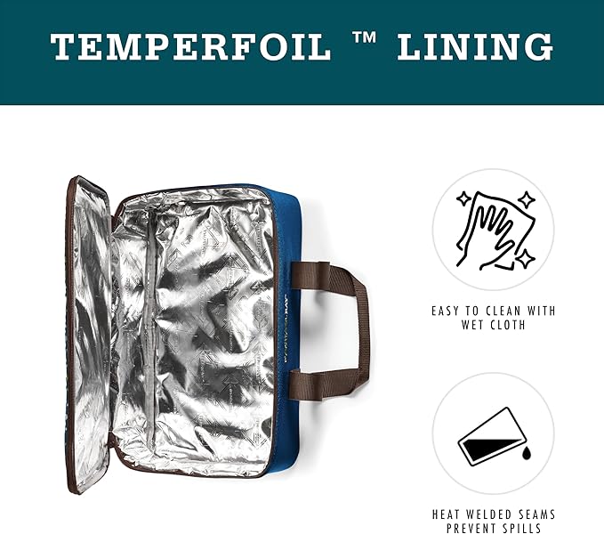 • THERMAL INSULATION: Premium foam insulation & Temperfoil lining keeps food hot or cold for hours. Whether packing a hot lasagna pan for a potluck or a cold dessert for a barbecue, this thermal insulated bag will keep food at any temperature.