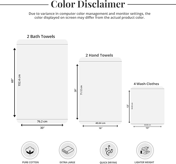 - This package contains 2 extra large bath towels 30 x 60 in, 2 hand towels 16 x 28 in and 4 washcloths 13 x 13 in