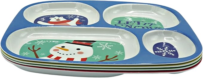 - DINNERWARE SET - Christmas dinner plates melamine dinnerware set for kids. Great for breakfast, lunch, snack too. BPA free Christmas dinner plates for toddlers, Makes cute Christmas party table decorations. Kids dinner plates with dividers are perfect for picky eaters