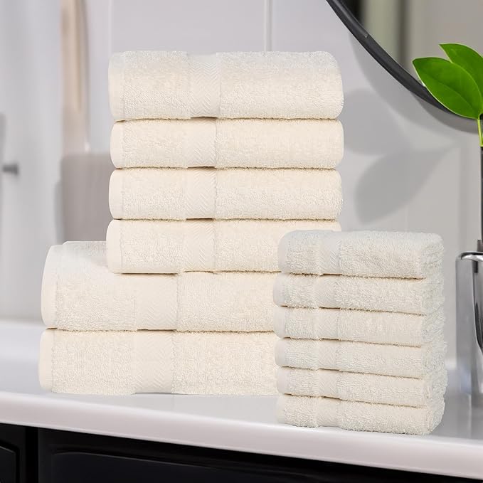Superior 12-Piece Cotton Assorted Towel Set, Includes 6 Face/Washcloths, 4 Hand, and 2 Bath Towels, Lightweight Essentials, for Home, Gym, Beach, Bathroom, Quick Drying, Franklin Collection, Ivory