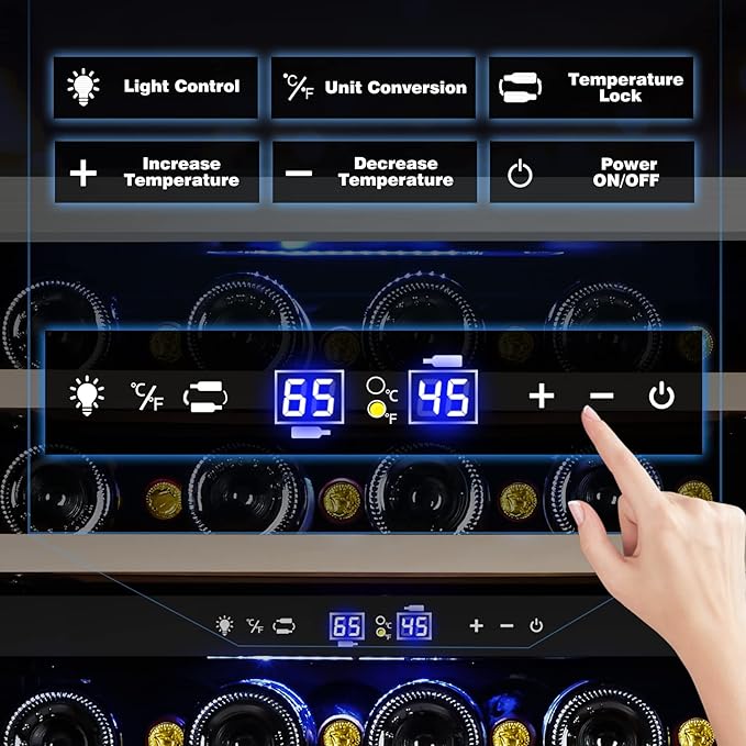 - 【Dual Zone Wine Cooler】This dual zone wine cooler is a unique design that addresses the hassles of storing diverse wine collections, It can accommodate larger bottles, such as Champagne. The upper zone ranges from 40°F to 55°F while the lower zone is between 55°F to 65°F.