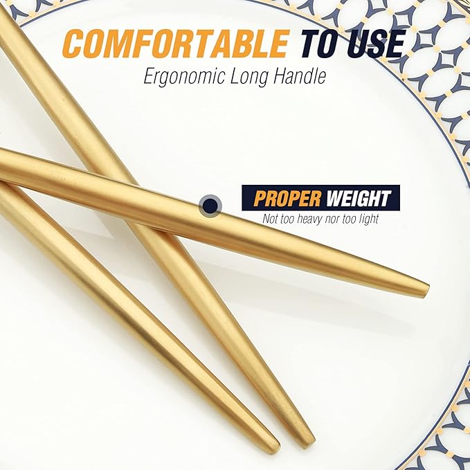 - 【Stainless Steel】This golden eating silverware set is made from premium stainless steel material, with no sharp edges, stylish and extraordinary, round and sleek lines, especially the edges where your fingers hit are smooth for safe use.