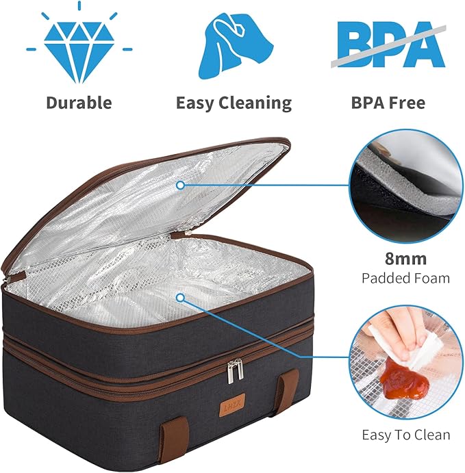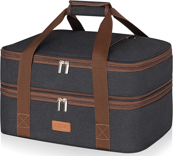 LHZK Double Decker Insulated Casserole Carrier for Hot or Cold Food, Expandable Hot Food Carrier, Lasagna Holder Tote for Potluck Parties, Picnic, Beach, Fits 11 x 15 or 9 x 13 Baking Dish (Black)