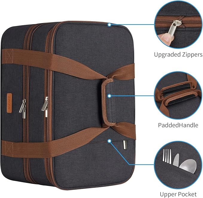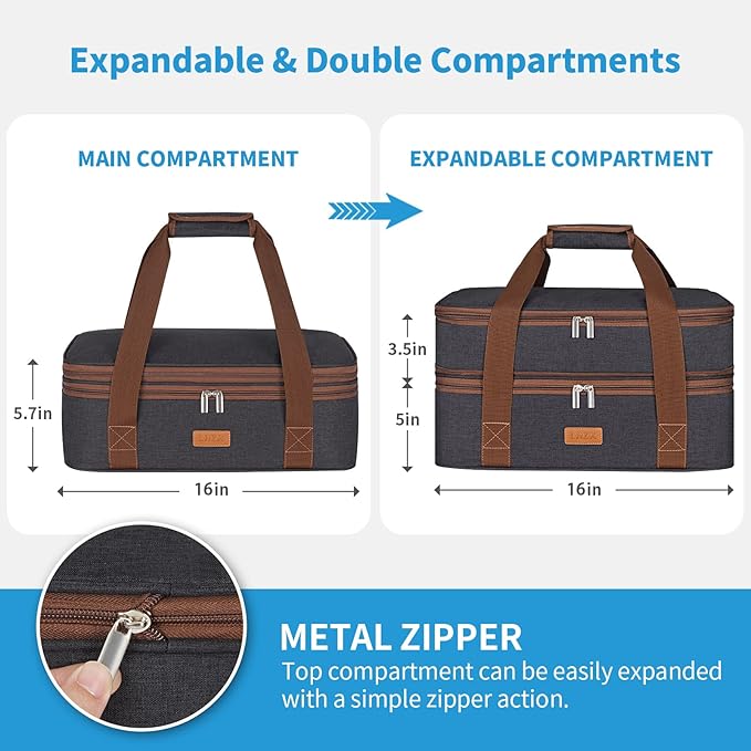 - 【Professional Double Deck Design】The grey color is stylish. Large capacity, features two compartments. Professional design and lightweight construction, which allow you to store hot and cold foods separately. If you want to use it as a double decks food carrier, it can be expanded with a simple zipper action effortlessly to take to potluck parties, picnics, tailgates, BBQ and cook-outs.