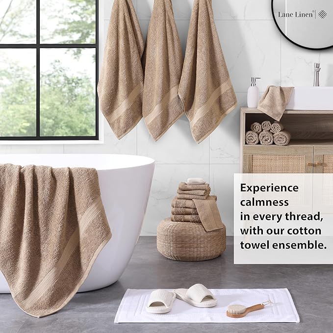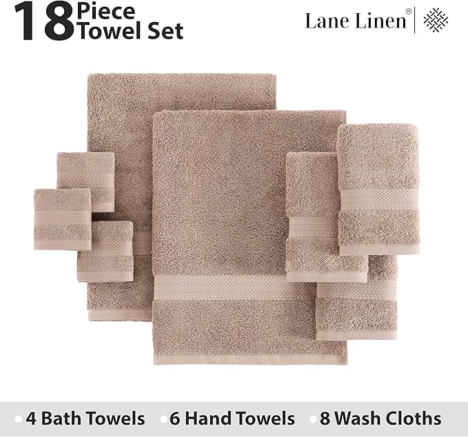 LANE LINEN 100% Cotton Bath Towel Set, 18PCs - 4 Shower Towels, 8 Washcloths, 6 Hand Towels for Bathroom - Sustainably Produced & Oeko-Tex Certified, Pet Friendly & Ultra Absorbent - Taupe