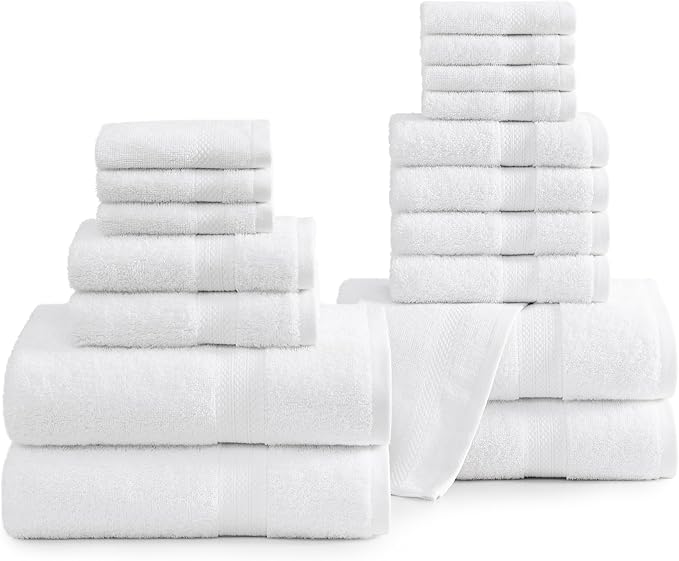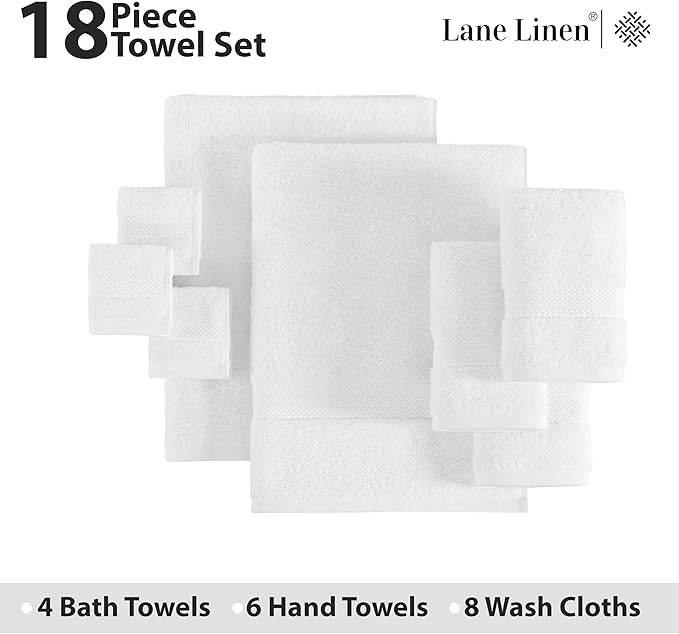 LANE LINEN 100% Cotton Luxury White Bath Towels - 18 Pieces, Ring-Spun Technology - 4 Bath, 8 Washcloths, 6 Soft Hand Towels, Machine Washable, Remains Soft & Absorbent Even After Multiple Washes