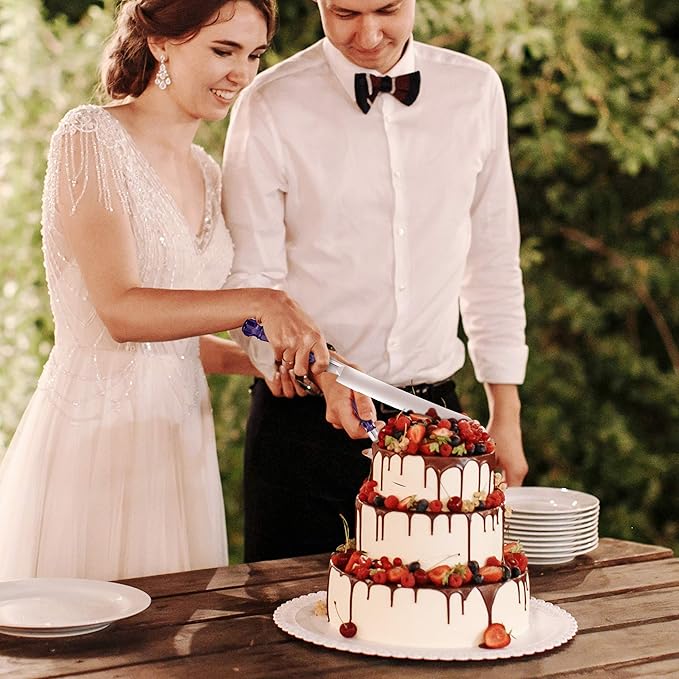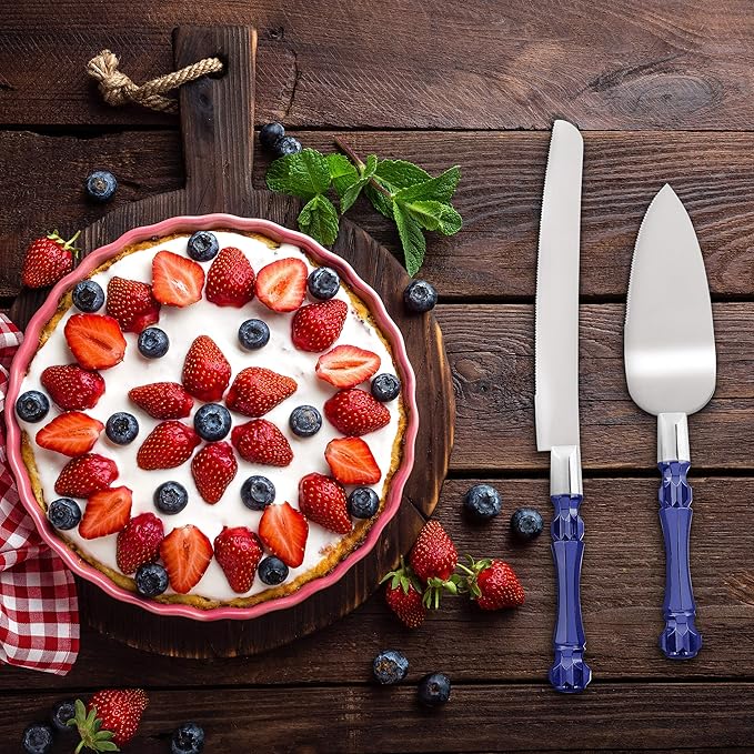 - 🍴EXCELLENT CRAFTSMANSHIP: Our Blue cake knife and server set are expertly crafted from premium stainless steel, providing the ultimate pair for a sophisticated cake. Each pack comes with an elegantly crafted stainless steel cake knife and stainless-steel cake server that are designed to add a memorable and sophisticated touch to the look of any cake-cutting ceremony. Add a touch of glamour to your event with our cake-serving ensemble that will not go unnoticed.
